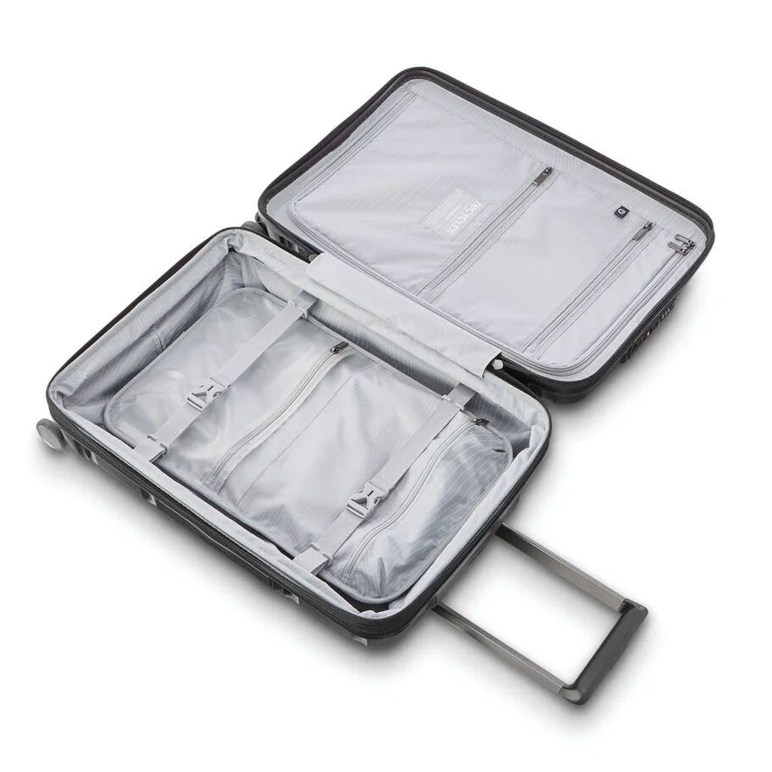 - Dieses elegante und schlanke Modell ist startklar – und lässt keine Wünsche offen: vom geformten Trolleygriff bis hin zu den leicht zu greifenden Griffen an Oberseite und Seiten. Mit integrierten Extras wie einem eingebauten TSA-Schloss und USB-Anschluss sowie einem hervorragend anpassbaren Innenraum, der mit unserem umweltbewussten Recyclex®-Gewebe ausgekleidet ist, verbindet dieses unverzichtbare Reiseutensil Form und Funktion nahtlos miteinander.