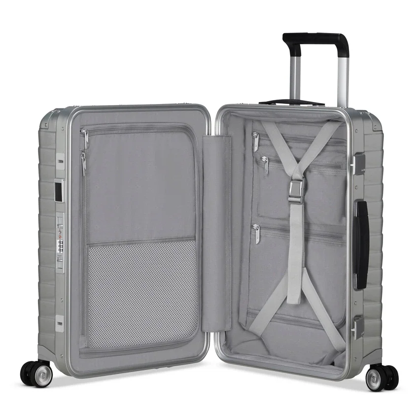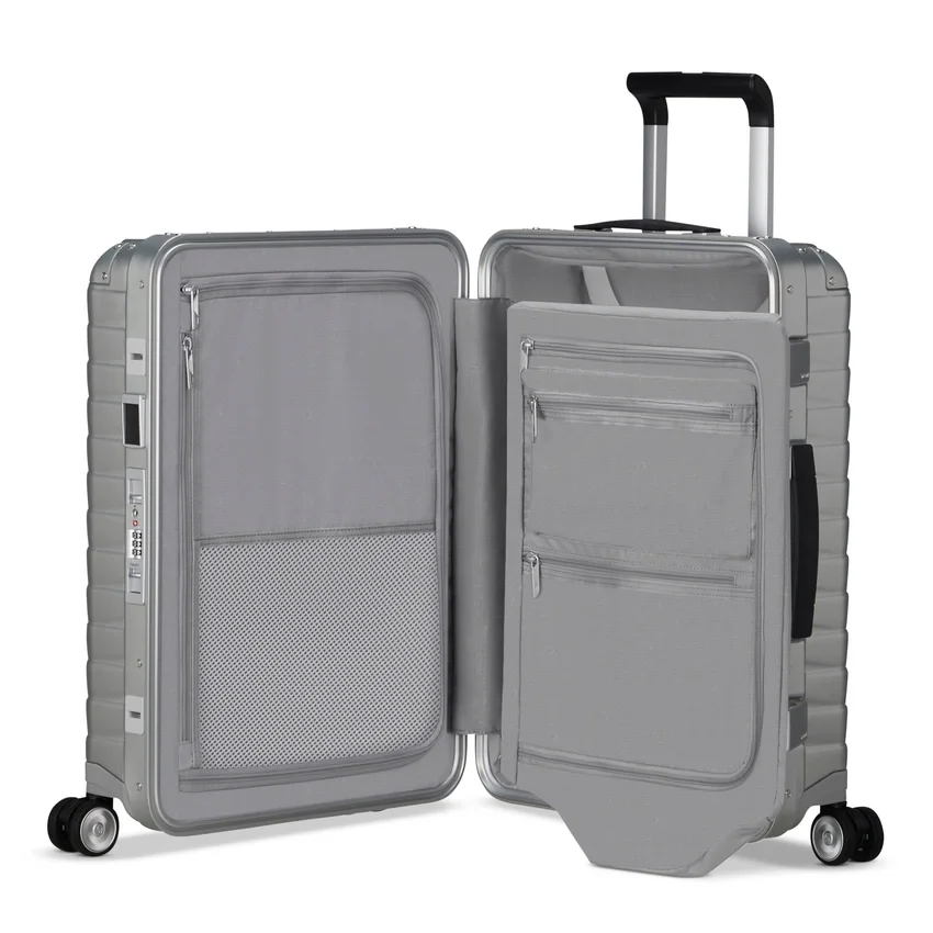 Robust und dennoch auffällig: Unser 5,37 kg schwerer Handgepäckkoffer aus Aluminium ist mit all den beliebten Funktionen ausgestattet, die Sie schätzen gelernt haben. Dazu gehören 360°-Spinner-Rollen für müheloses Reisen und TSA-zugelassene Schlösser. Mit der Zeit bekommt Aluminiumreisegepäck leicht Kratzer und Dellen, was ihm mit jeder Reise mehr Charakter verleiht.Außenausstattung: