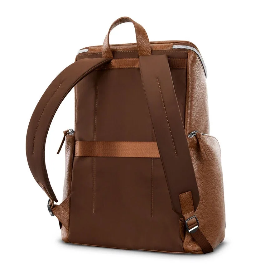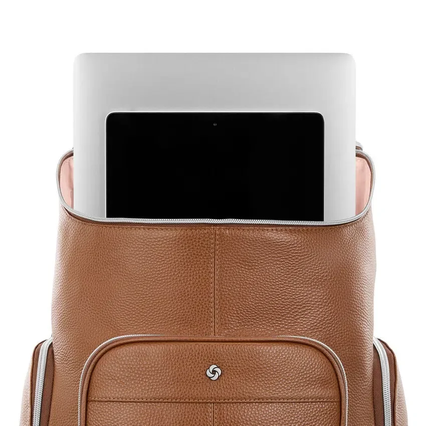 Der Deluxe-Leder-Rucksack verfügt über gepolsterte Laptop- und Tablet-Fächer, eine geräumige Fronttasche, zwei seitliche Reißverschlusstaschen für Ihre Wasserflasche oder Ihren Regenschirm sowie bequeme Schultergurte. Der integrierte Stackit™-Gurt erleichtert Ihnen den Weg zur Arbeit und auf Reisen.