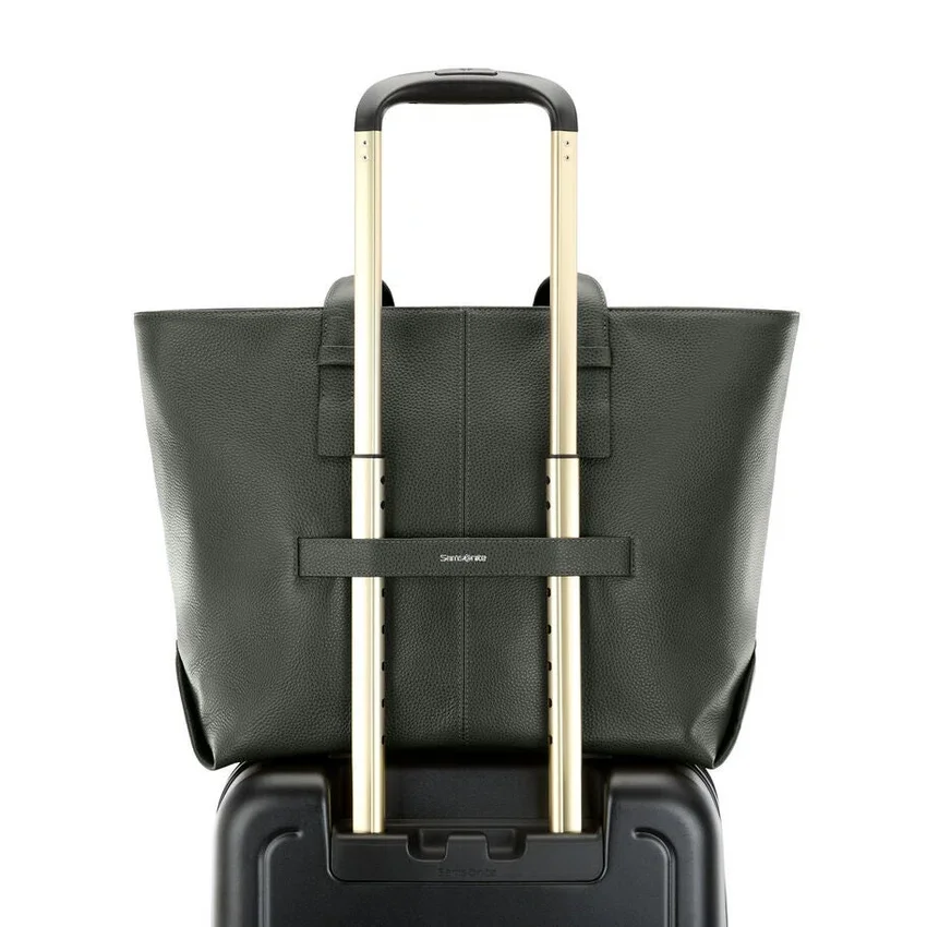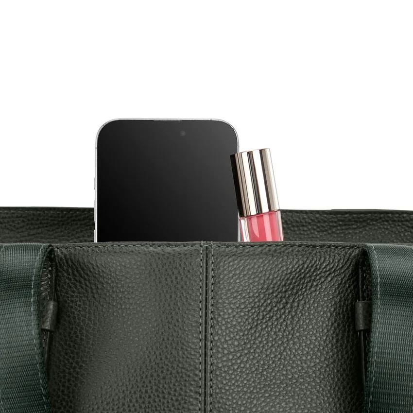 Im Inneren des Ledershoppers finden Sie eine gepolsterte Laptoptasche, eine Halterung für eine Wasserflasche sowie Fächer zur Organisation. Ein unauffälliger Stackit™-Gurt auf der Rückseite sorgt für müheloses Reisen, egal ob Sie ins Büro gehen oder einen Wochenendausflug machen.